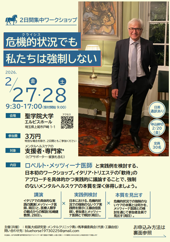 | 主催(共催) | 和氣大城研究室、メンタルクリニック青い馬準備委員会(代表・工藤由佳) |